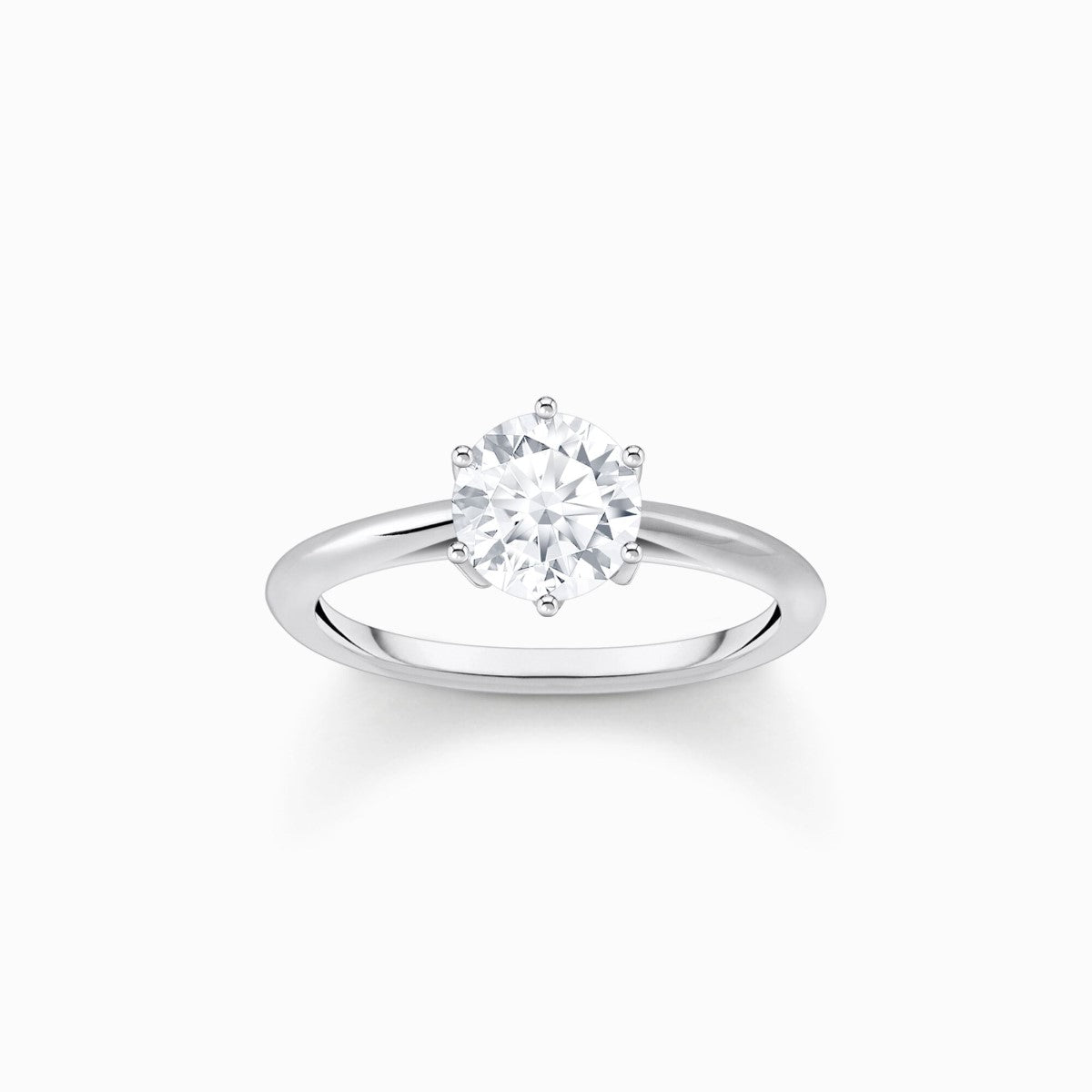 A must-have classic Thomas Sabo ring. Upgrades any outfit and fits every occasion. Crafted from recycled silver and set with a brilliant cut white zirconia, the open 5 prong setting allows the stone to sparkle.