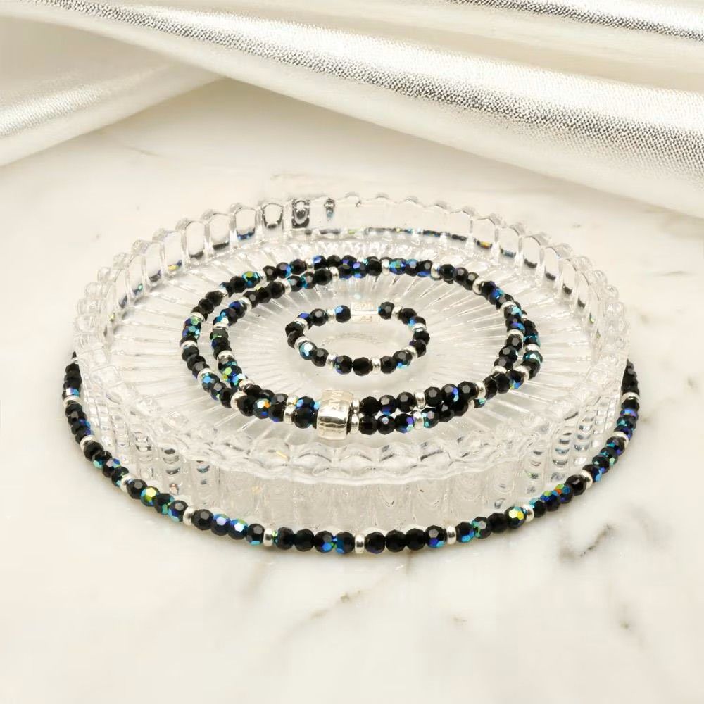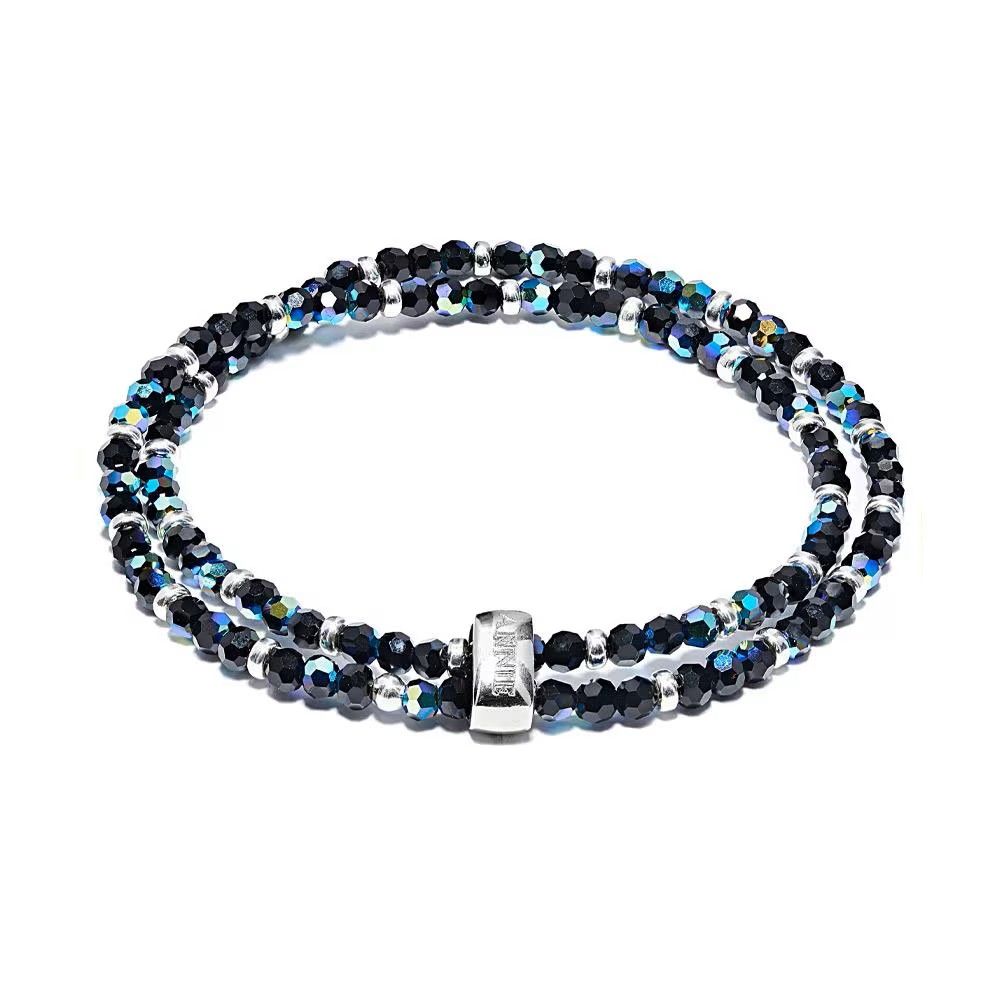 The Annie Haak Looped Mini Blisski Silver Bracelet features two shimmering strands adorned with jet-black Preciosa crystals and 925 Sterling Silver details, all held together by a sleek silver loop.