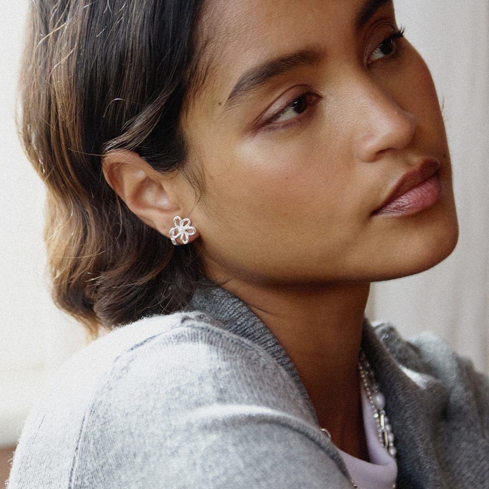 Meet your new favourite earrings by Daisy London. Featuring 100% recycled sterling silver daisy inspired bows with a freshwater pearl at the centre, these studs look just as good styled solo as they do stacked up.
