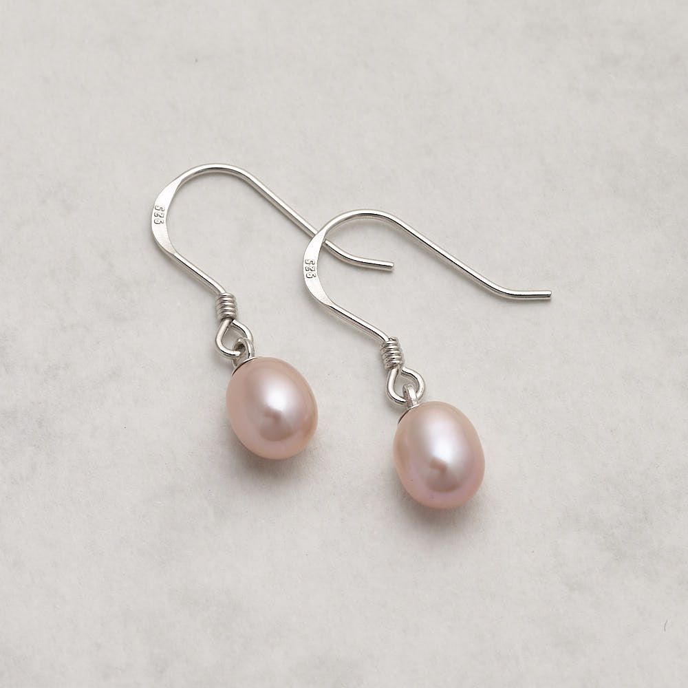 Jersey Pearl's Hook Silver and Pearl earrings are a comfortable choice for everyday wear to add a classy look to any outfit. The soft pink coloured pearls add a feminine touch.