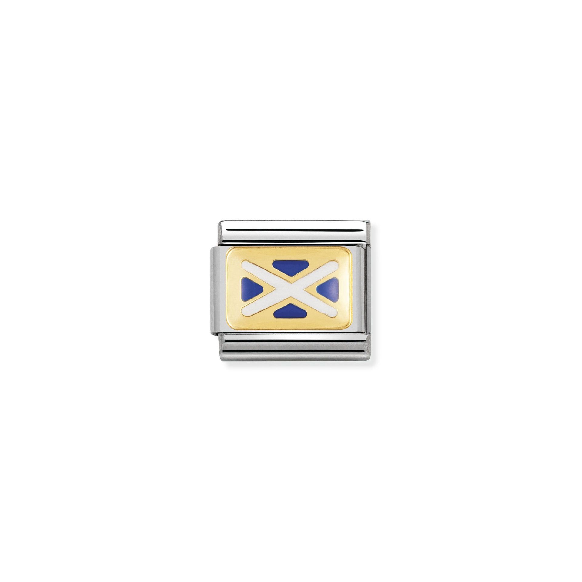 This Nomination tile charm is crafted with stainless steel and finished with 18k gold. The Scotland flag is in a beautiful yellow gold with blue and white enamel that will highlight your personality and unique style on your Nomination bracelet.