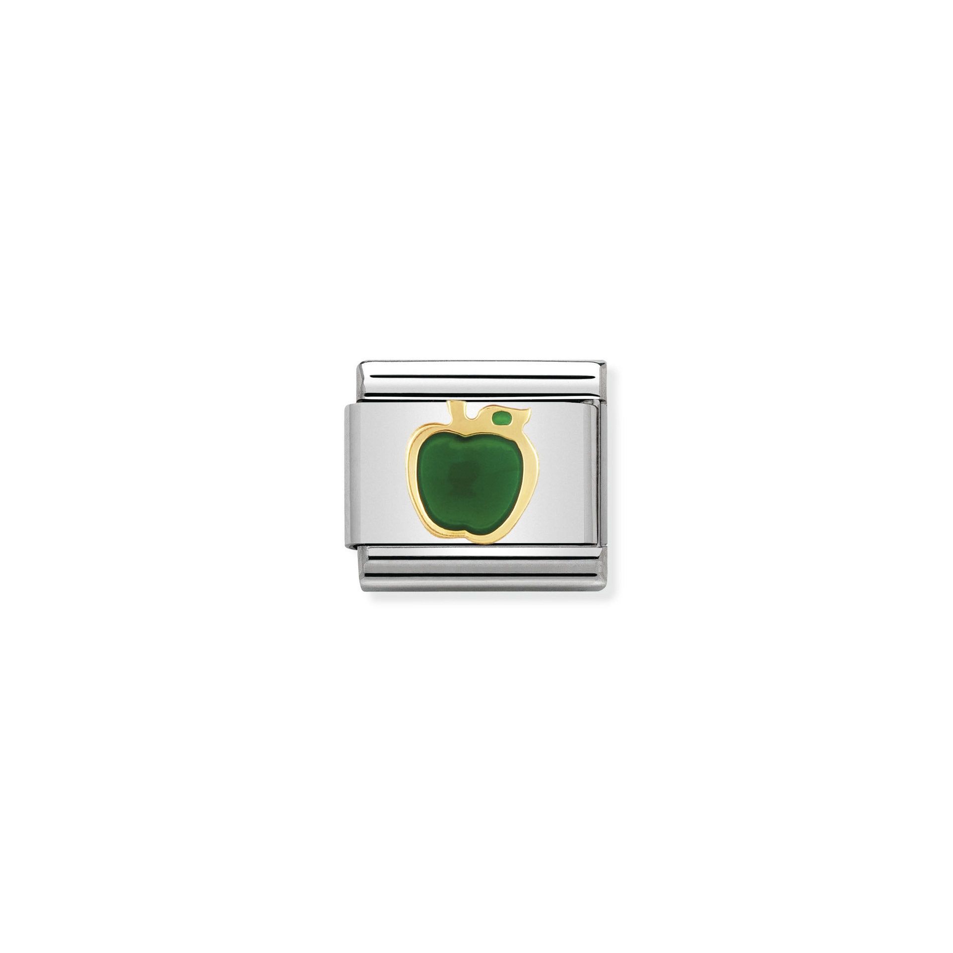 This Nomination tile charm is crafted with stainless steel and finished with 18k gold. The Apple is in a beautiful yellow gold with green enamel that will highlight your personality and unique style on your Nomination bracelet.
