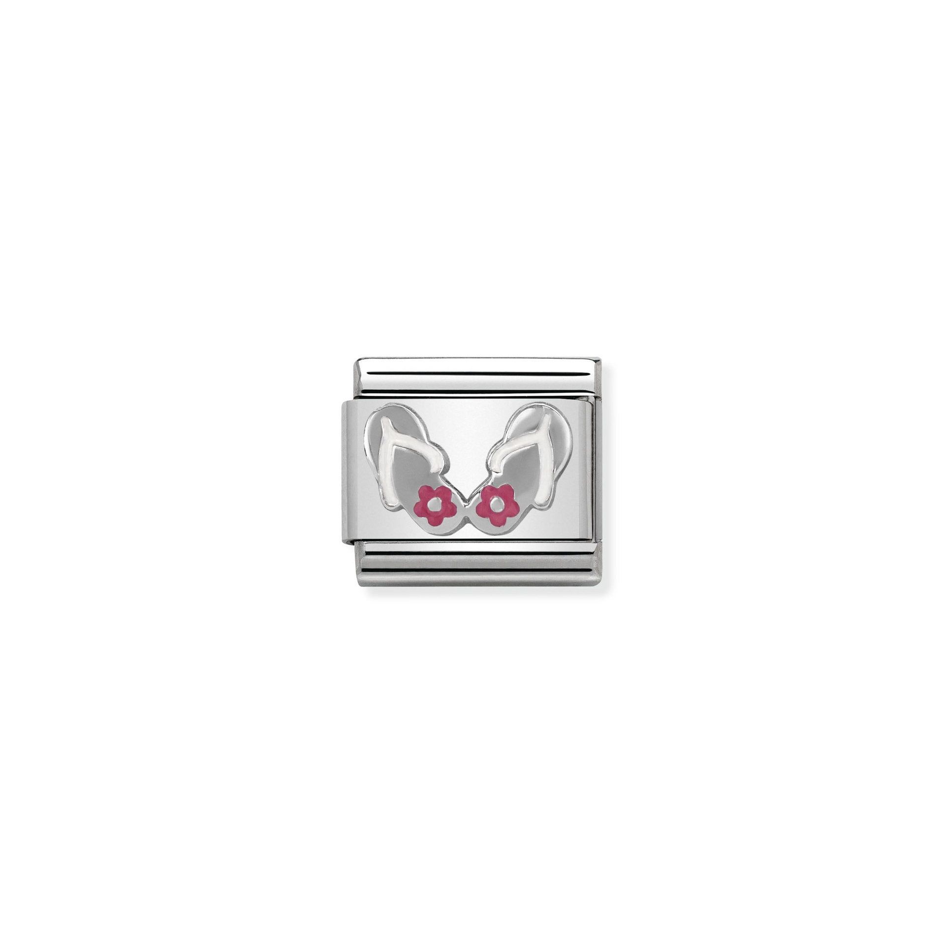 This Nomination tile charm is crafted with stainless steel and finished with 18k gold. The Flip-Flops is in a beautiful yellow gold with pink and white enamel that will highlight your personality and unique style on your Nomination bracelet.