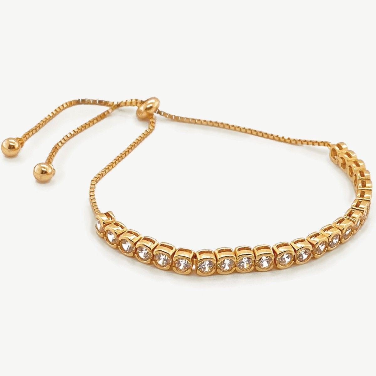 This clean cut tennis bracelet by Sarah Alexander is ready to be your new everyday go-to bracelet. It features bezel set solitaire zirconia crystals in a round brilliant cut, handcrafted in 18ct gold plated sterling silver.