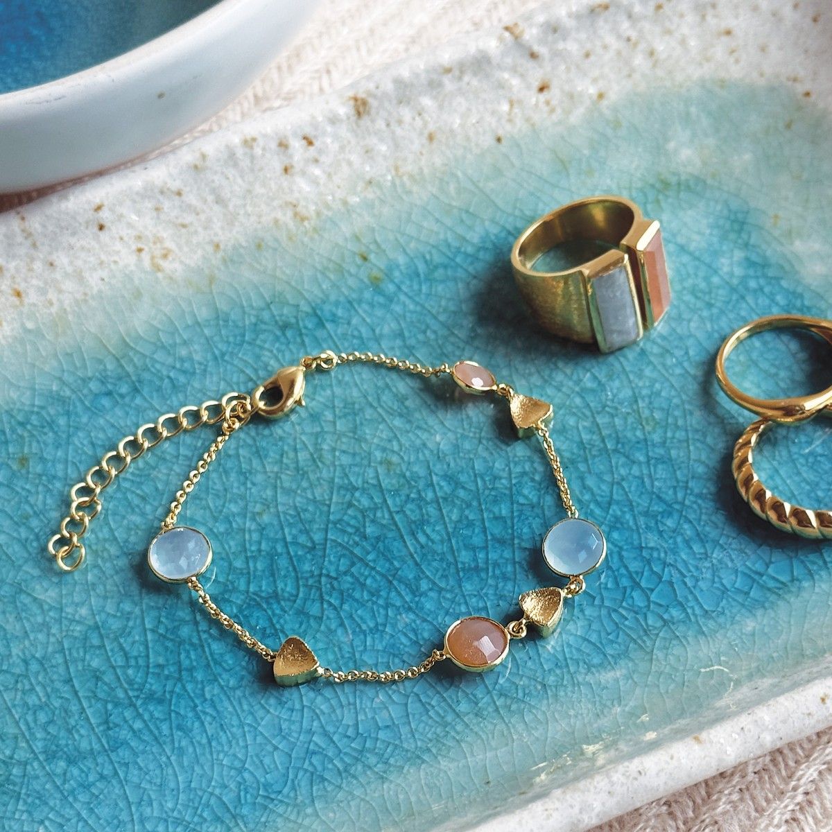 Add this Sarah Alexander Tahiti Sunset Gemstone Charm Bracelet to your bracelet stack and enjoy the properties of its natural gemstones - aquamarine and peach moonstone.