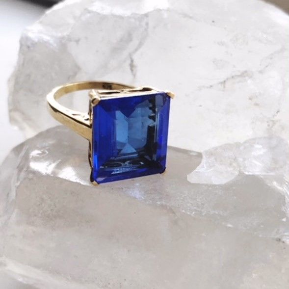 This Shyla London Claudia Ring with a tanzanite-inspired blue hydro glass chunky stone is a true statement piece. Featuring a detailed cage holding the vivid blue stone, this ring is crafted in high quality sterling silver with 22k gold plating.
