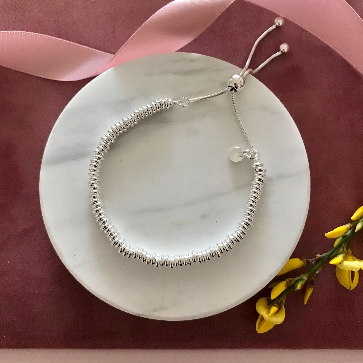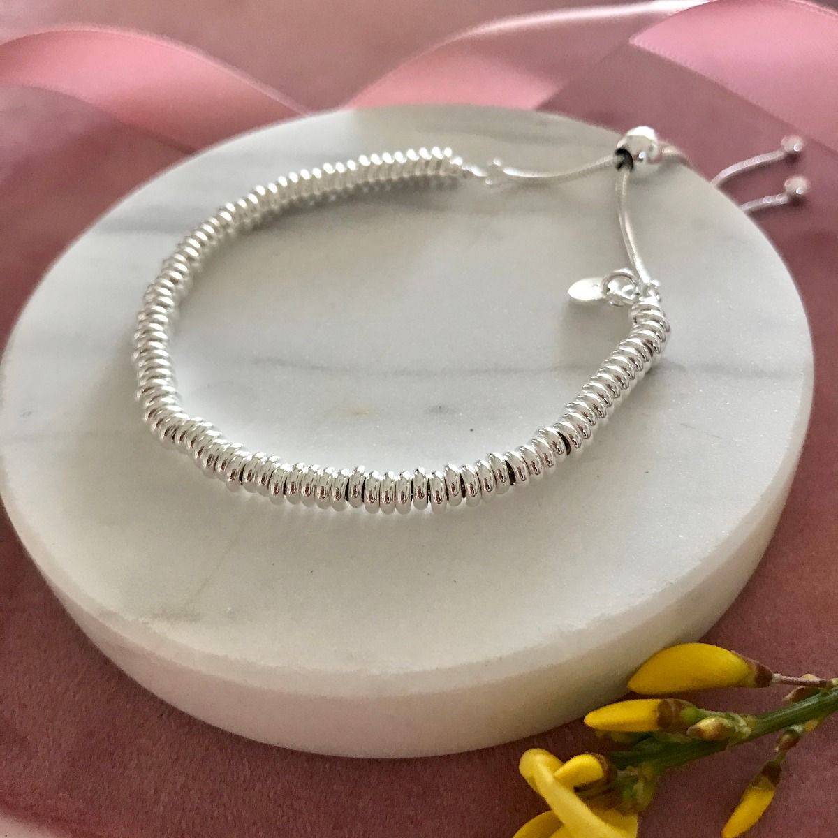 This 925 Sterling Silver beaded slider bracelet is a link bead style bracelet. The adjustable slider closure makes it easy to put on and comfortable to wear.