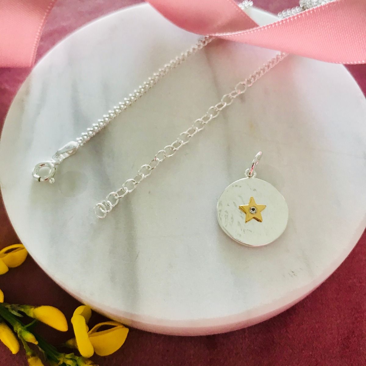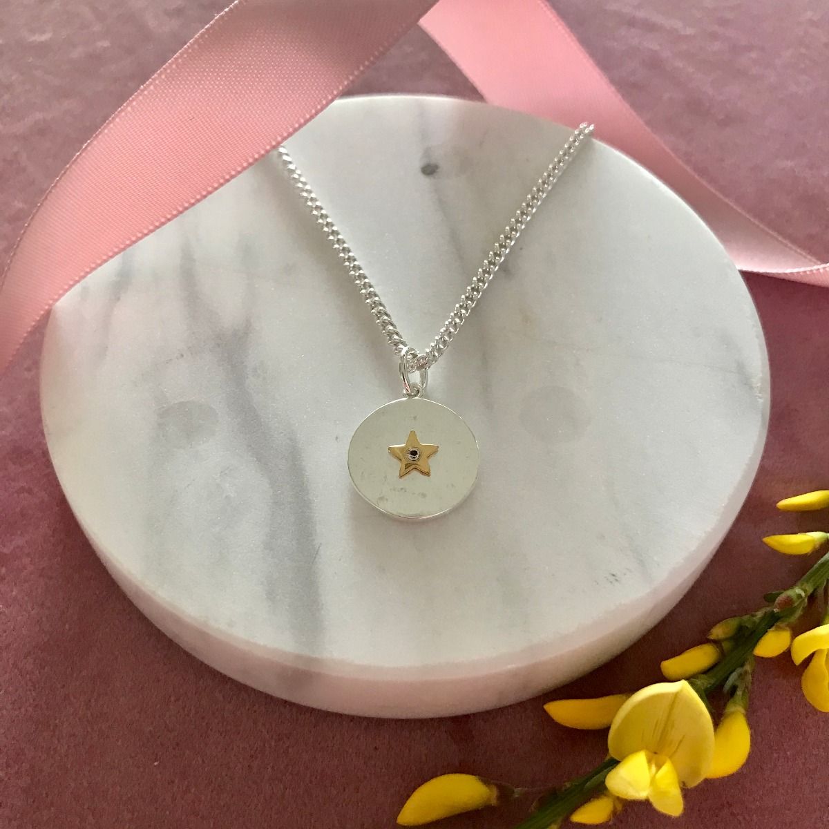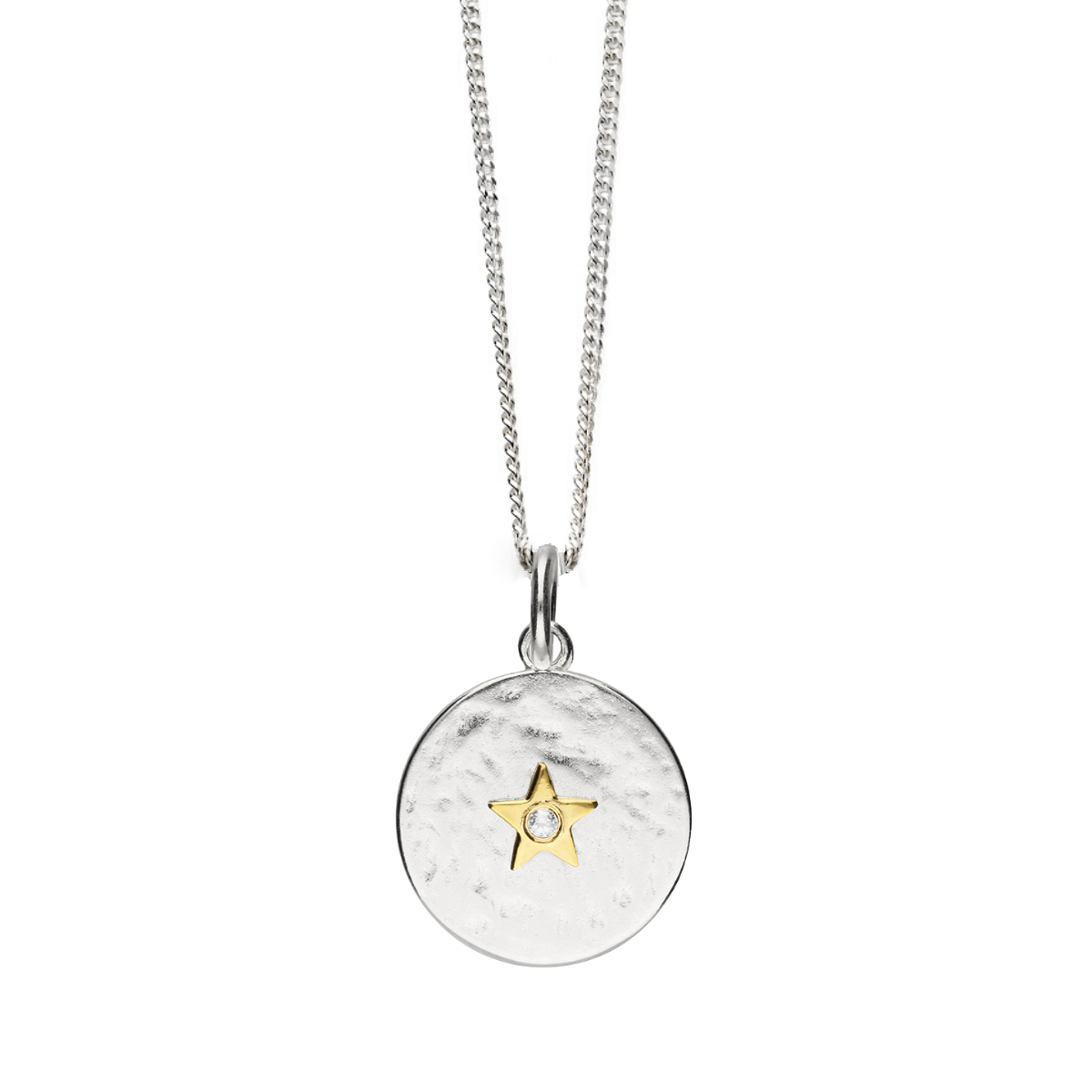 A pretty hammered star pendant, featuring the April birthstone. Crafted from solid Sterling Silver with a touch of yellow gold plating in the form of a central star motif.