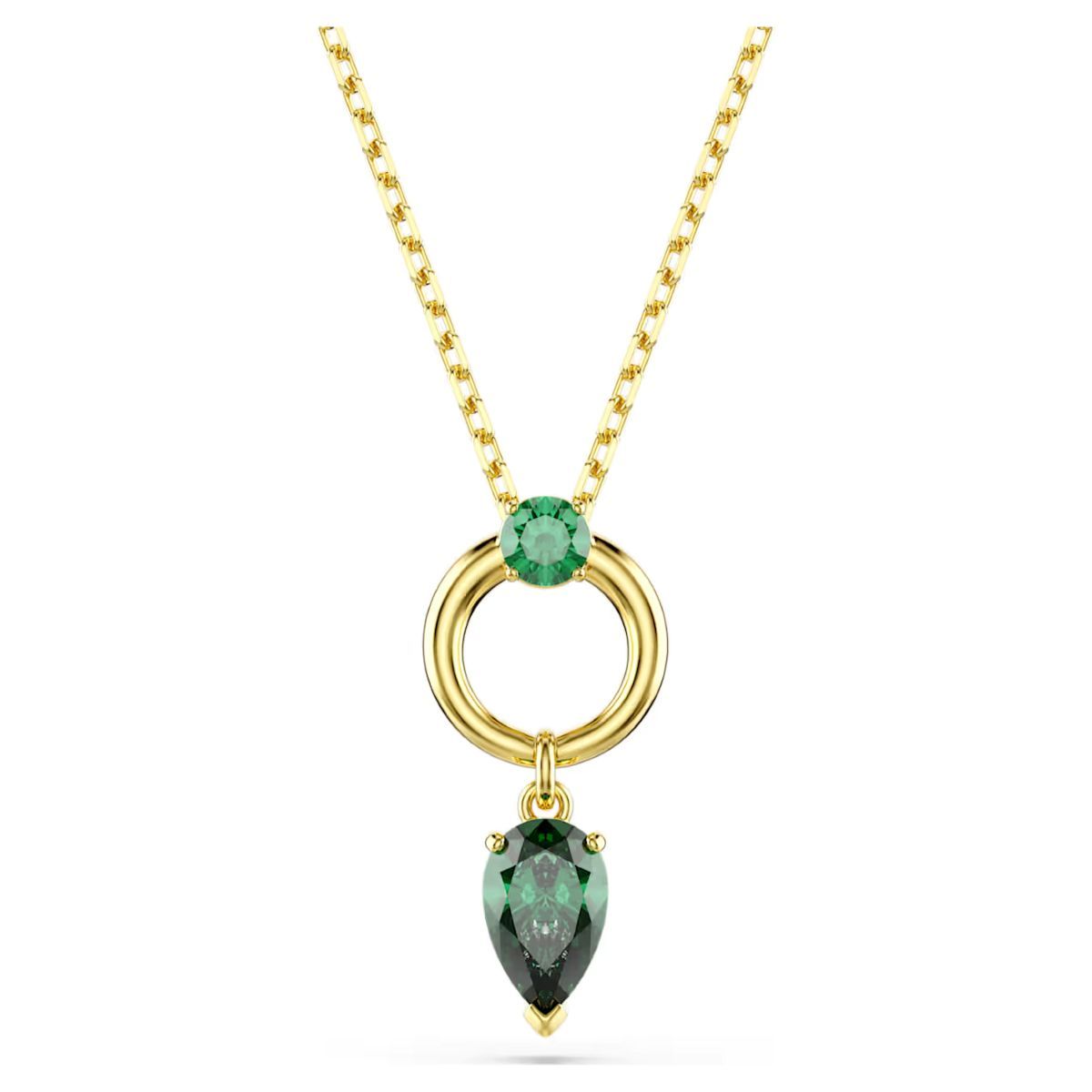 Add a touch of colour to your everyday style with this Swarovski Mesmera pendant, featuring a pear-cut green Swarovski crystal attached to a gold-tone plated hoop with a round-cut at the centre. A sliding clasp allows the necklace length to be easily adjusted.