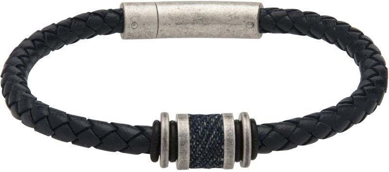 Add this classic and masculine bracelet to your everyday style. This bracelet is crafted from navy leather with a denim inlay and features an antique silver steel clasp.